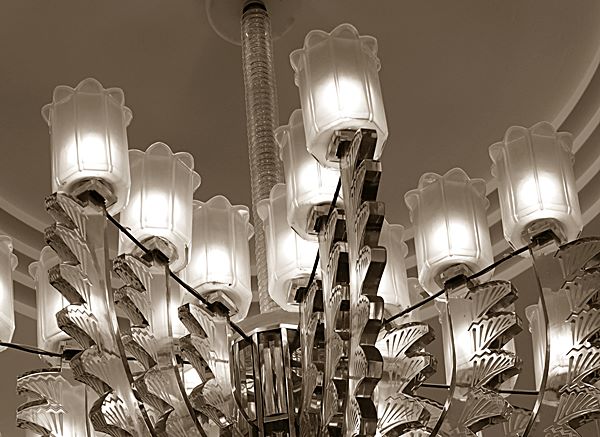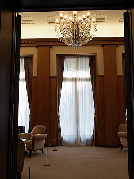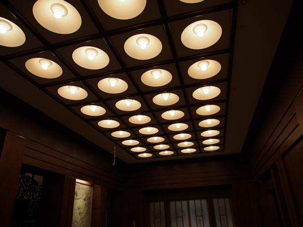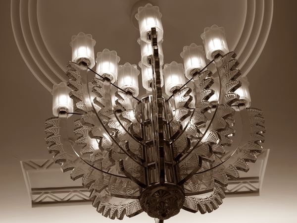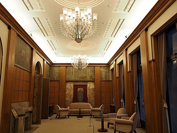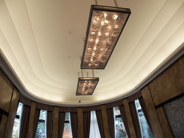朝香宮邸に使用されているラリックの代表作品は玄関のガラスレリーフ扉です。また、そのほかにも室内の照明器具として、ラリックが制作したシャンデリアが2種類使われています。