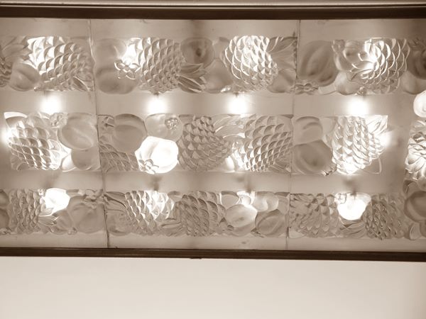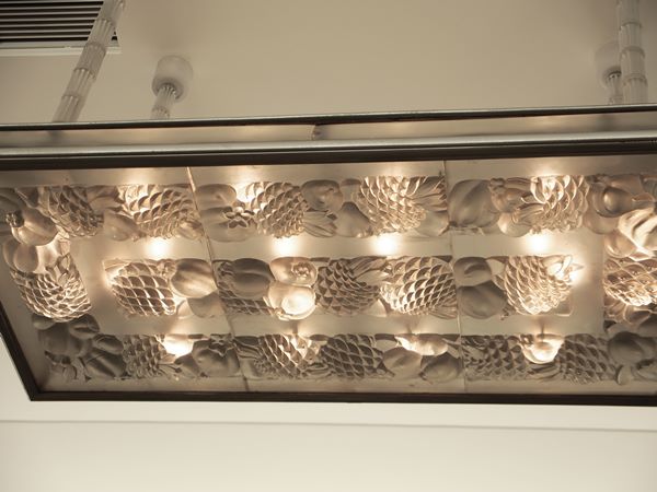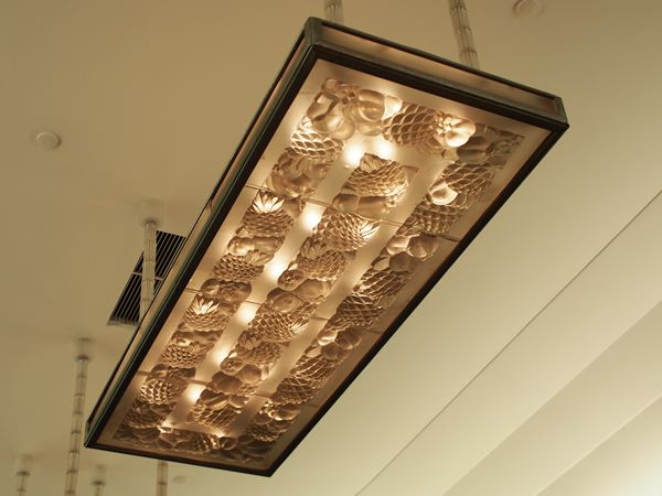 大食堂のシャンデリア)(パイナップルとざくろ)は、直方体の本体に果物模様を密集させたガラスを嵌め込み、艶消し加工することで均一な光を食卓に配光しています。