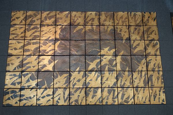 ロビーの陶板壁画は、加山又造の「涛と鶴」。現代の琳派継承者と評価されています。