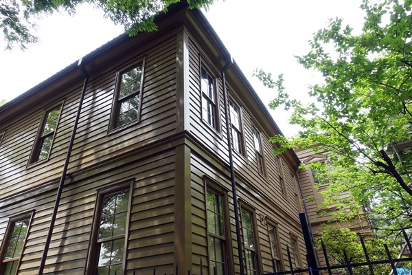 壁の横板張りで、お互い少しずつ重なり合うように取り付けた、典型的な下見板の建築。板を平坦に張るよりも雨水の浸透を防ぎやすいので、和風、洋風とも木造建築の外壁に使用される。洋風下見ではペイント塗り、和風下見では柿渋(かきしぶ)などを塗って化粧と防腐を兼ねることが多い。