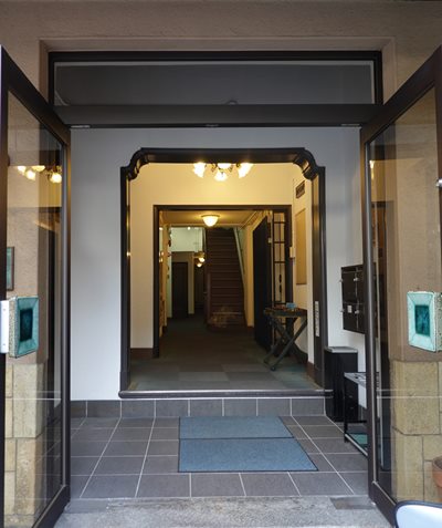 間口7.9mの南北に長い敷地に北面道路から退いて建つ。鉄筋コンクリート造、地上3階地下1階建、塔屋付で、外観はスパニッシュスタイルとする。光庭を中核として、地階から屋上まで立体的なプランニングをなす。都市型住宅の好例である。(文化遺産オンラインより)