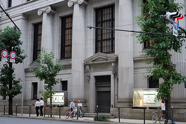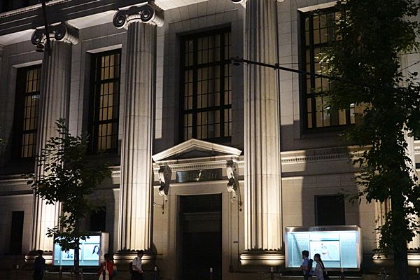 コリント式柱、天井、ヘルメスの杖のレリーフ。高い天井に大理石と御影石を使った内装。