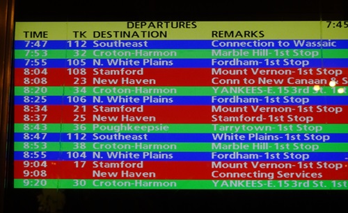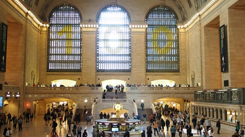 マンハッタンにある鉄道のターミナル駅の一つです。グランドセントラル駅には40以上あるプラットフォームはすべて地下にあり、目当ての列車の時刻を探して、番線まで行き着くのに時間がかかります。NYのマンハッタン島ではほとんど地下を通っています。